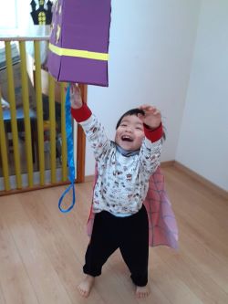 ピニャータの紐を楽しそうにおいかけていますね~😊