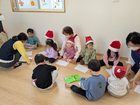 ちょっと休憩😊座ってキャンドル渡しをしたり、🎅サンタクロースの絵かき歌をしました😊